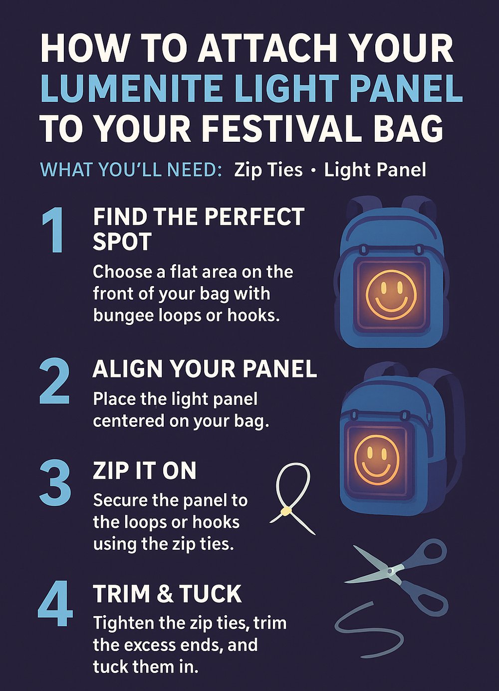 Whether you're heading to a rave, music festival, or night event, your LUMENITE light panel is designed to shine bright and stay secure. Here's a quick guide on how to attach your panel to your backpack or hydration pack for the best results, plus a video tutorial to walk you through it!